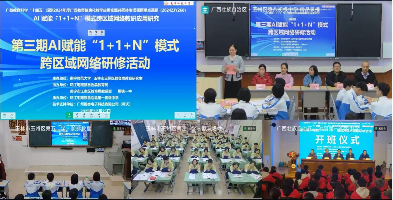 12月25日、26日,由beat365平台官方网站教育科学学院余朝文教授主持的“AI赋能‘1+1+N’模式跨区域网络教研应用研究”项目,开展第三期AI赋能“1+1+N”模式跨区域网络研修活动。本次活动由beat365平台官方网站教育科学学院主办,由实验区玉林市玉州区教育局教育研究室承办,实验区河池市环江毛南族自治县教育局、南宁市江南区教育局教研室及柳铁一中联合协办,广州视睿电子科技有限公司(希沃)提供技术支持。四县区的教育局及教研室相关领导、10所学校的领导、老师和学生出席开班仪式并全程参与活动。