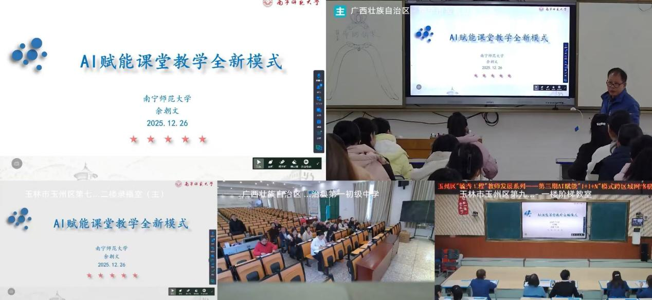12月26日上午,beat365平台官方网站教育科学学院余朝文教授在南宁市金凯初级中学,以《AI赋能课堂教学全新模式》为题,在线上线下向广西四个实验县区的专任教师作学术讲座,把第三期AI赋能“1+1+N”模式跨区域网络研修活动推向高潮。