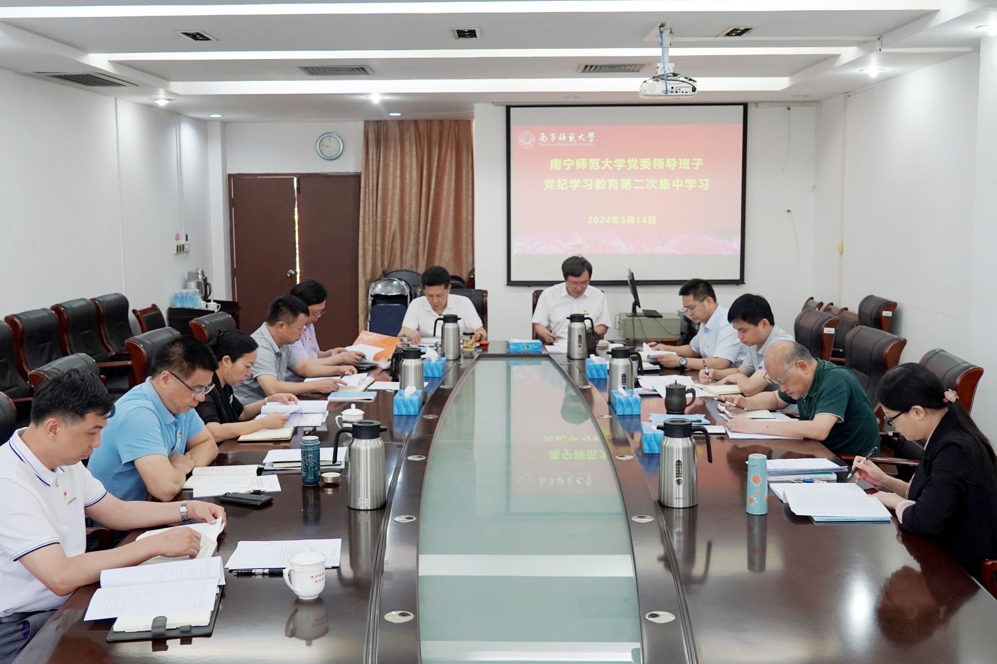 5月14日,为期1天的学校党委领导班子党纪学习教育第二次集中学习在明秀校区鸿远楼407会议室举行。校党委常委参加集中学习,组织部、宣传部、统战部、纪委办(监察室)等部门负责人列席学习。