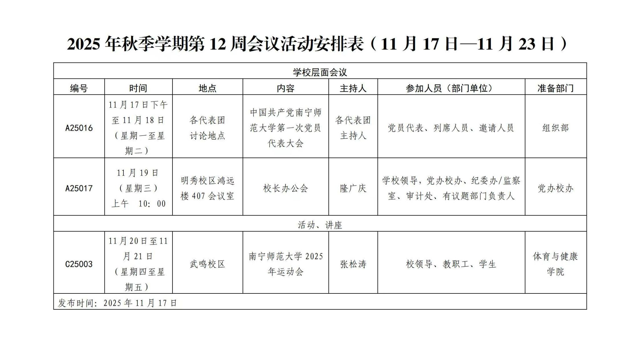 2025年秋季学期第12周会议活动安排表(11月17日—11月23日)